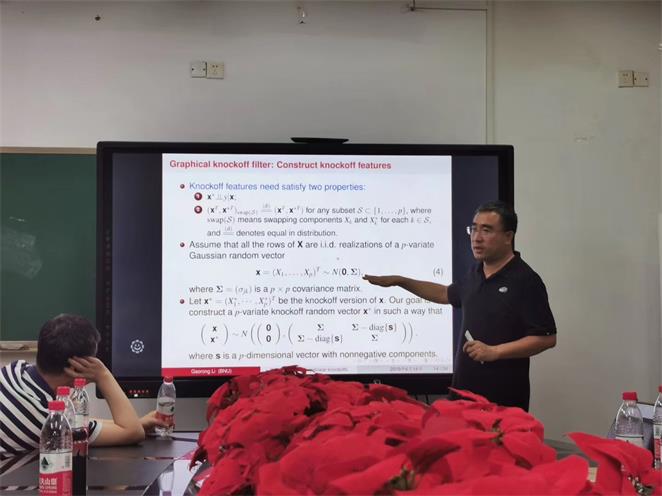 李高荣教授首先以彩票为例,介绍了一系列高维假设检验的背景。针对实际遇到的高维假设检验问题,通过引入FDR方法,针对一系列非线性模型,基于knockoff矩阵,提出了高维假设检验方法。最后,讨论了阈值的选取以及检验的性质。报告结束后,李教授与在场的老师和同学进行了交流。
