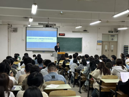 10月31日下午在江北校区B106,ok138cn太阳集团数据科学系邀请猪八戒网数据支持中心总经理、重庆市人工智能技术创新战略联盟常务理事谭光柱先生给2023级数据科学与大数据技术专业和数据计算及应用专业约120名本科生做大数据行业发展趋势的讲座。数据科学系副主任袁利军教授参加。