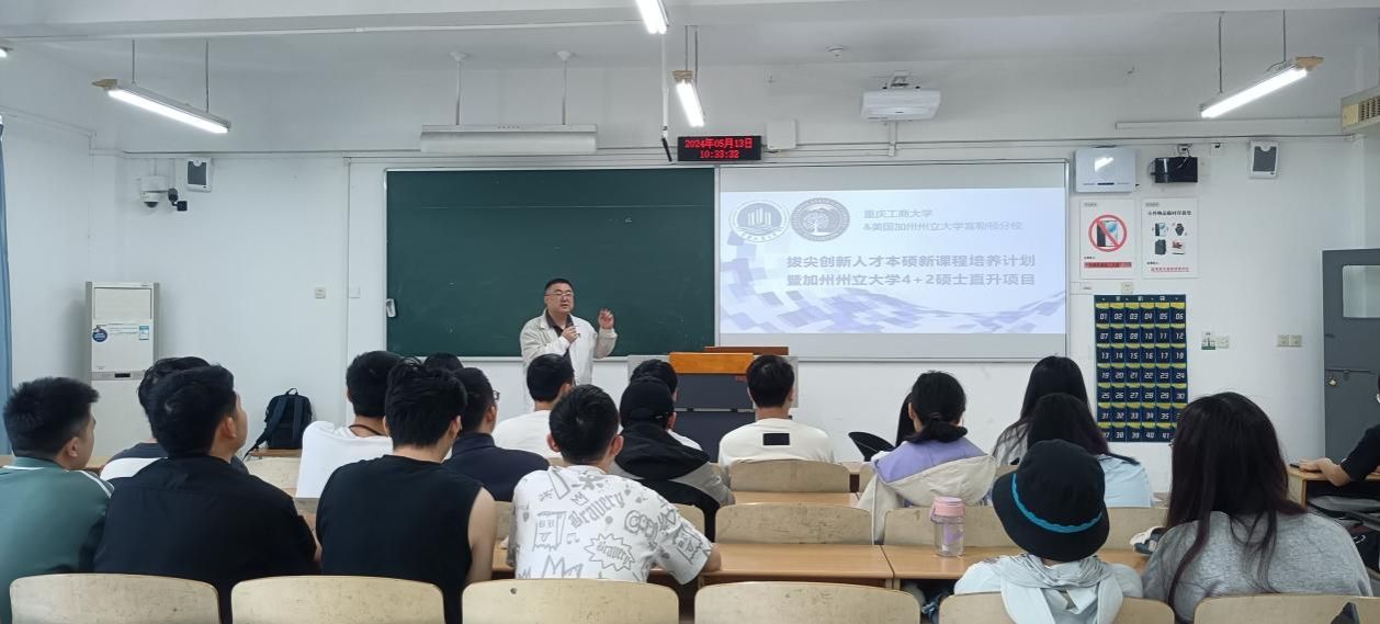在宣讲活动中,丁诚主要从项目及学校背景、拔尖人才本硕新课程培养暨硕士直升4+2介绍、项目申请流程三方面展开,对该项目进行了详细介绍。他讲到,项目具有专业性强、学习时间短、综合费用低、科研项目多,有安全的学习环境,以及优秀华人校友和教授对在校期间的学习进行辅导等优点。除此之外,加州州立大学还与众多企业和机构建立了紧密的合作关系,为学生提供了丰富的实习和就业机会。他还表示,留学经历不仅能够提升自己的学术水平和综合素质,还能够培养自己的独立生活能力和跨文化沟通能力,鼓励同学们要抓住机会,勇敢面对挑战,努力实现自己的梦想。