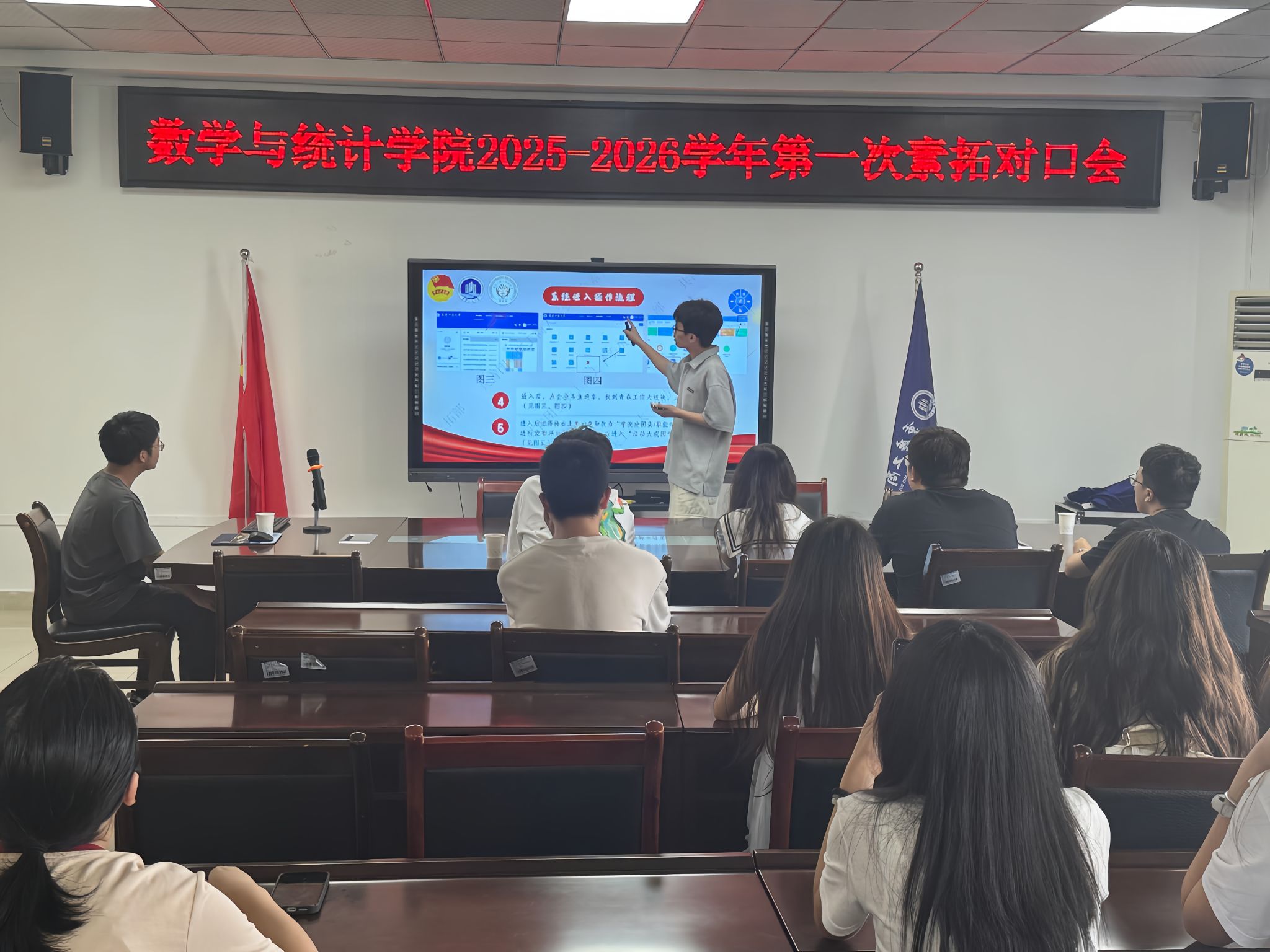 会议伊始,学生会学拓部负责人李忠林介绍了活动申报的前期准备工作,强调各部门在申报活动前须提交完整的活动策划书,内容应包括活动名称、联系人、活动时间等关键信息。他指出,规范申报流程是确保活动顺利开展的基础。