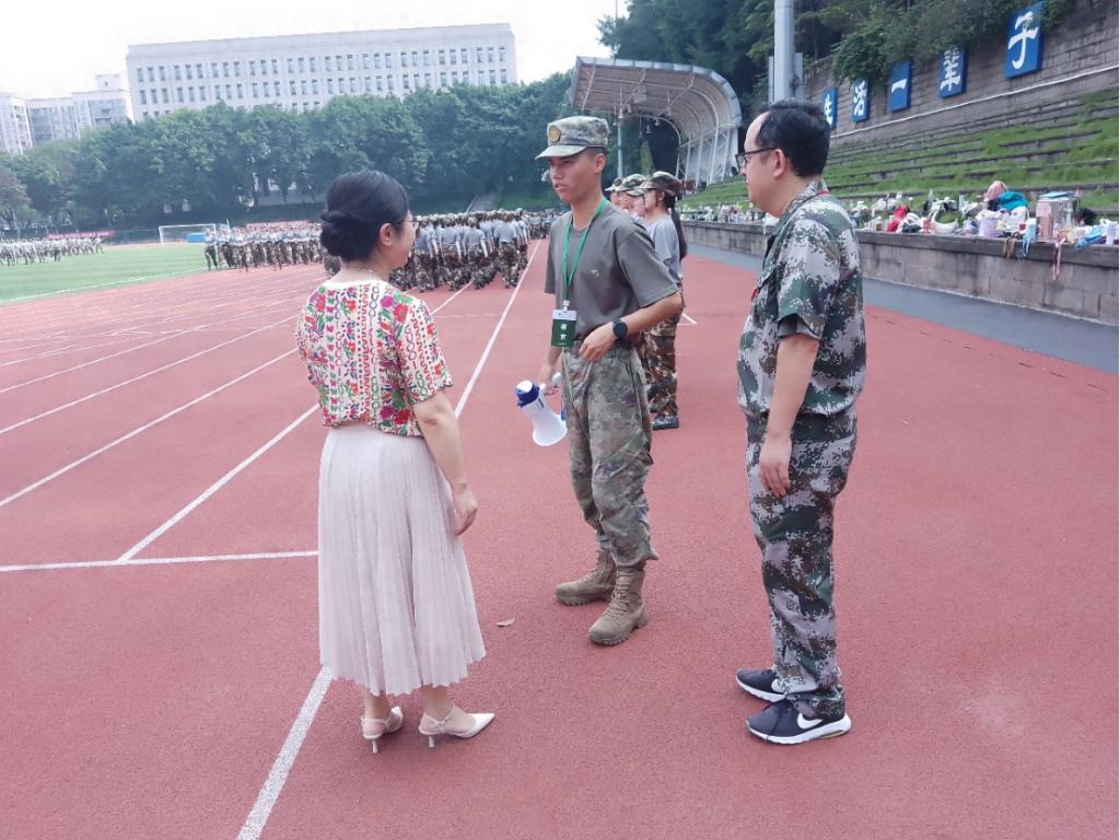 潘焱走进训练场,听取了教官的阶段训练汇报。她首先向各位教官多日以来的悉心教导、辛勤付出表示感谢,肯定了所有同学这段时间以来的军训成果。她特意向教官询问同学们和教官的身体健康状况,表示在正常开展军事技能训练的同时,不仅要注意防晒伤、风寒感冒问题,还需对有病史的同学重点关注,确保学生军训顺利进行。