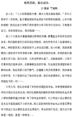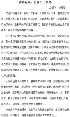 本次征文活动共收到79份投稿,同学们紧扣“励志”和“感恩”这一主题,围绕国家资助政策给自己的学习与生活带来的变化展开,在普通与多元化之间传达价值观,增强现实感知与人文关怀,展现出当代大学生积极向上的价值观、对国家与学校的感激之情。此次活动最终评选出特等奖1名,一等奖2名,二等奖3名,三等奖若干名。其中程静园同学的征文作品角度新颖,情感真挚,从众多作品中脱颖而出,荣获特等奖。