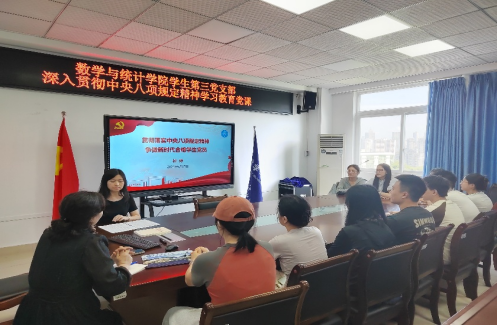 6月27日上午,ok138cn太阳集团党委副书记、纪委书记杨婷在启智楼80602会议室为学生第三党支部全体党员讲授深入贯彻中央八项规定精神学习教育专题党课。本次党课由支部书记郭春霞主持。