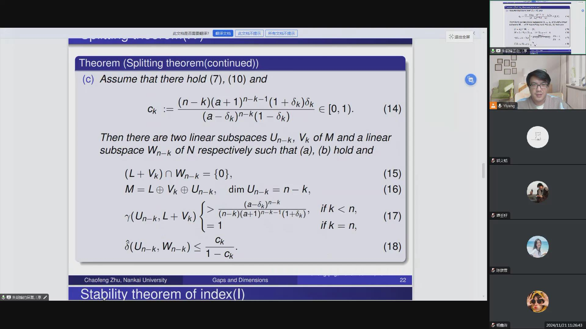 朱朝锋教授的报告主题是“Gaps and relative dimensions”。他集中讲解了巴拿赫空间中闭线性子空间的Fredholm四元组的概念,证明了Fredholm四元组的稳定性,阐释了闭线性子空间的半紧扰动概念。他指出,对于巴拿赫空间中一对闭线性子空间,其中一个是另一个的半紧扰动,证明了它们之间的相对维度是良定义的。如果扰动是紧的,相对维度是稳定的。