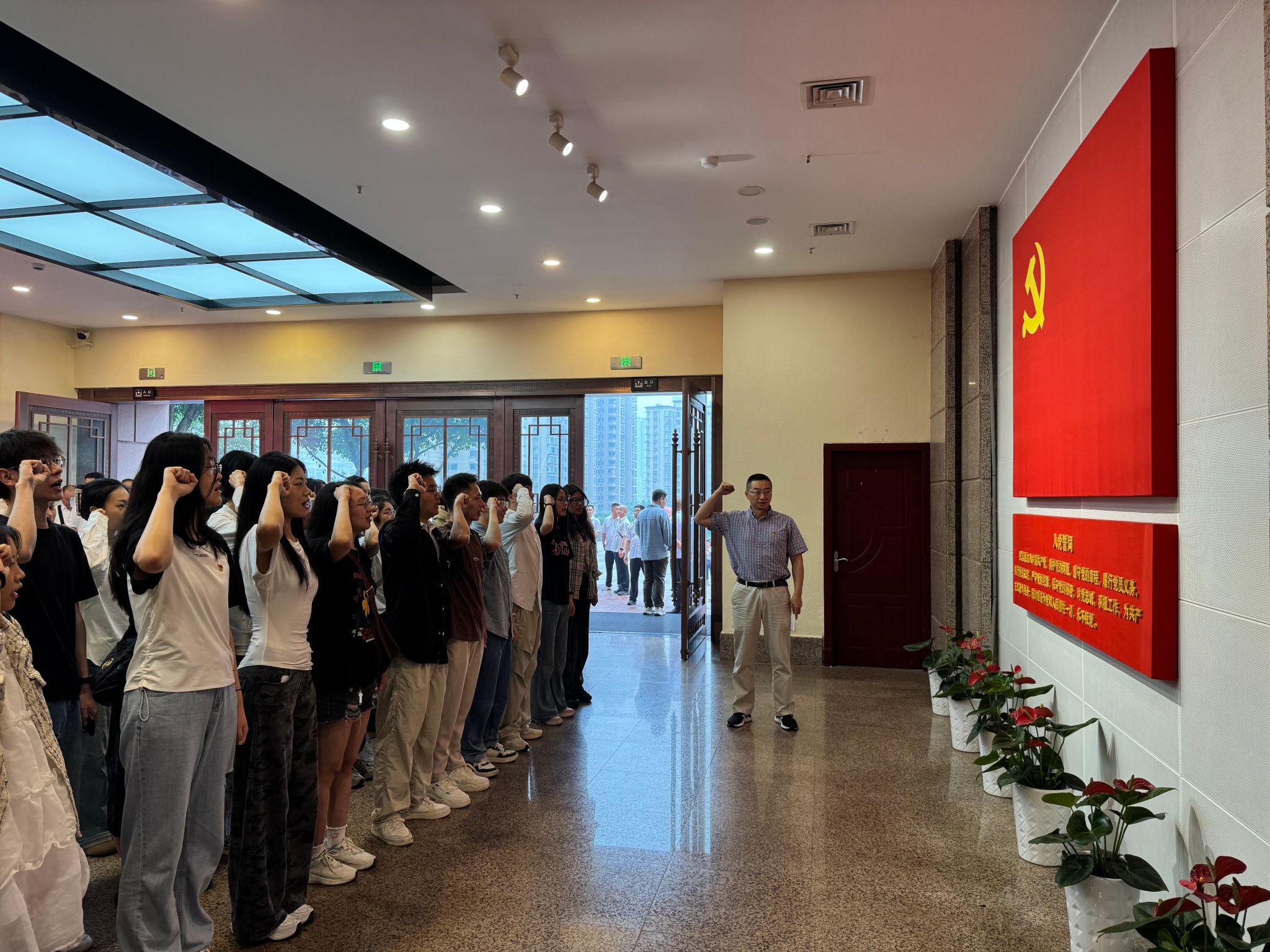 随后,专职组织员李华平带领全体毕业生党员面向党旗庄严宣誓,重温入党誓词。铿锵有力的誓言彰显出毕业生党员永葆忠诚、接续奋斗的决心。