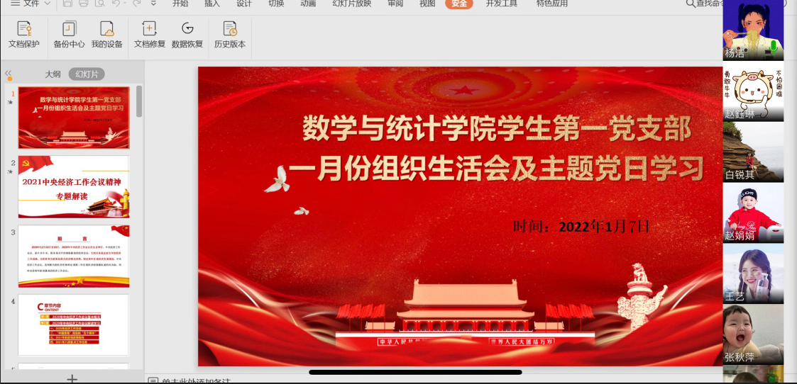 1月7日下午2点30分,ok138cn太阳集团学生第一党支部通过线上会议的形式召开1月份组织生活学习。会议由支部组织委员赵鈺琳主持,杨洁同志领学中央经济工作会议精神。